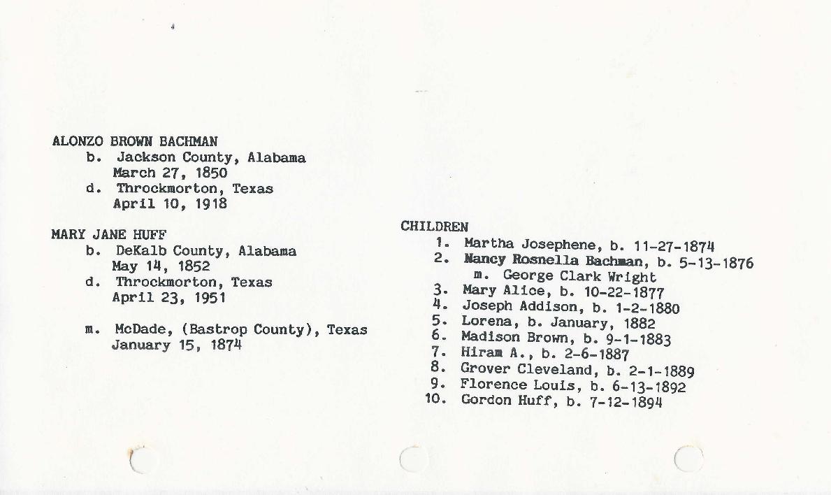 Alonzo Brown Bachman born in McDade, Bastrop, Texas 1850 wed